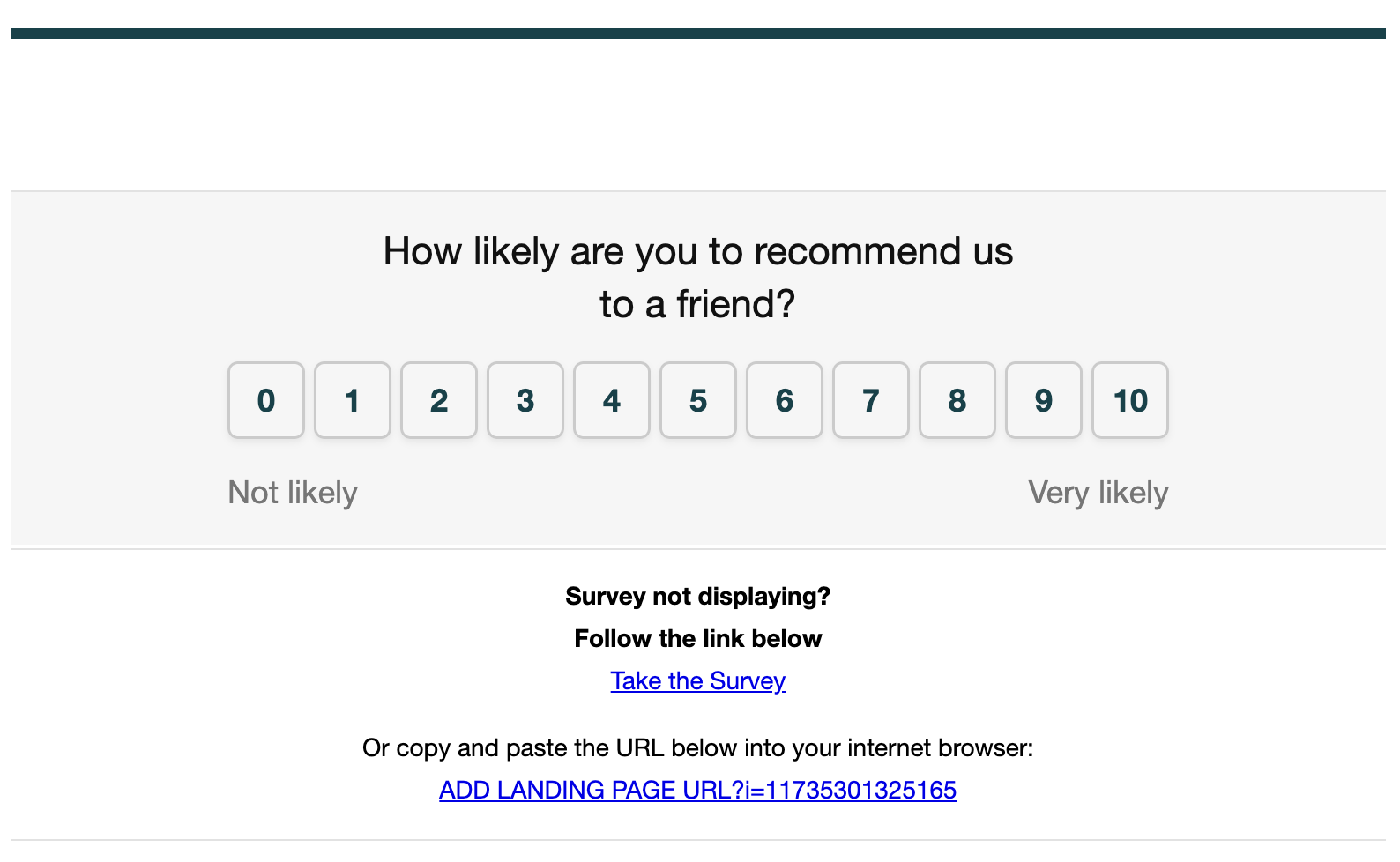 <td align="center" bgcolor="#FFFFFF" height="40" style="width: 42px; height: 40px; border-radius: 6px; box-shadow: rgba(0, 0, 0, 0.06) 0px 2px 4px 0px; border-color: rgb(204, 204, 204); border-style: solid; bor der-width: 1px 1px 3px; background-color: transparent !important;" valign="middle" width="42"> <a aria-label="10, Very likely" href="ADD LANDING PAGE URL?i={{ event.extra.id|default:'' }}&r=0" rel="noopener noreferrer" style="display:block;line-height:40px;text-decoration:none;font-size:18px;font-family:'Helvetica Neue', Helvetica, Arial, sans-serif;font-weight:bold" target="_blank">
