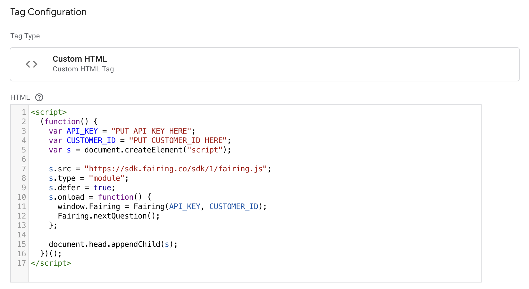 For Tag Configuration, select Tag Type = Custom HTML. Paste the Fairing snippet from our Standard Install docs into the HTML box.
