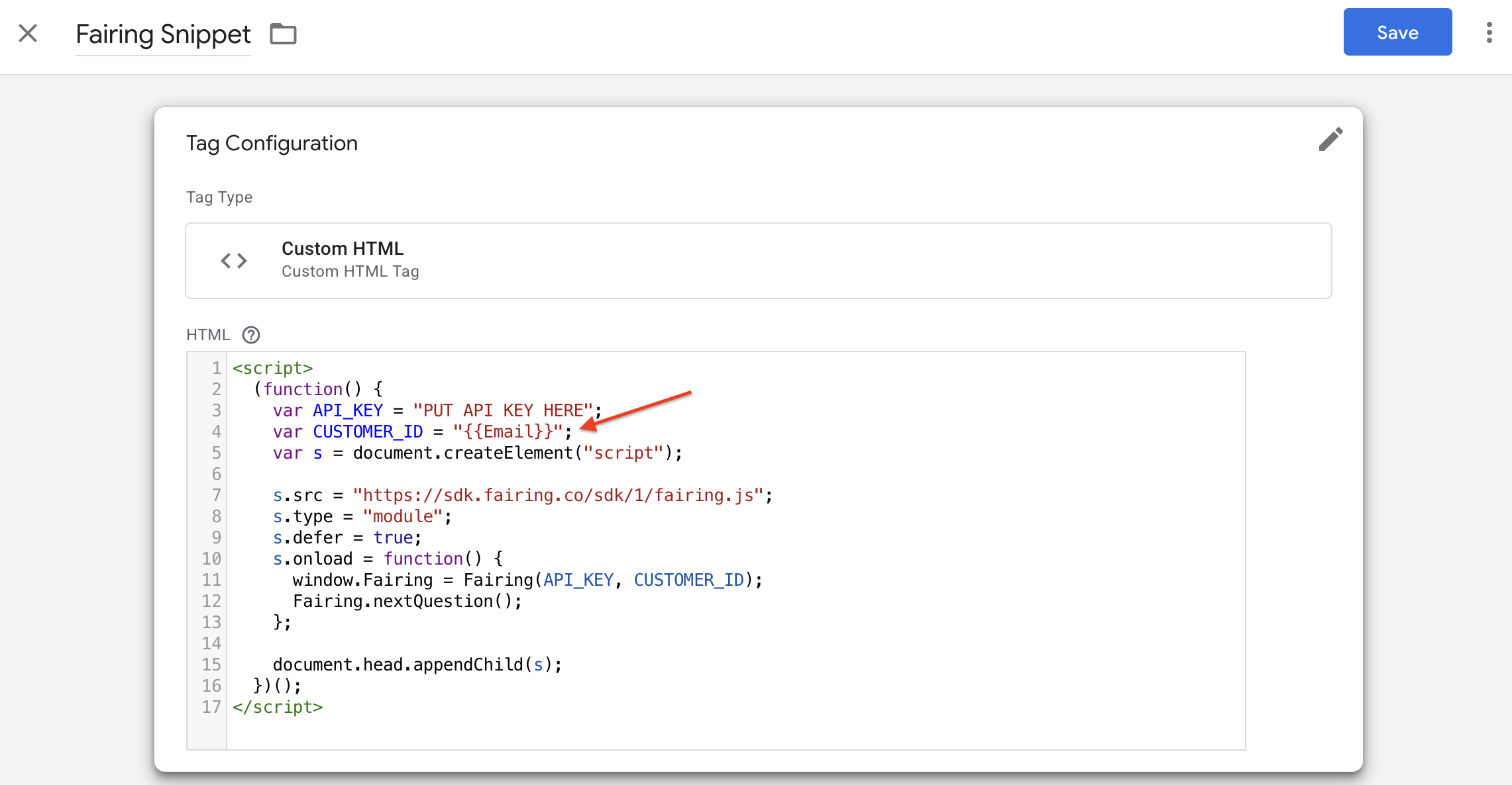• Replace "PUT CUSTOMER ID HERE" with the GTM Variable you created in Step 1 - start typing {{ and your User-Defined Variables will display in a drop down.