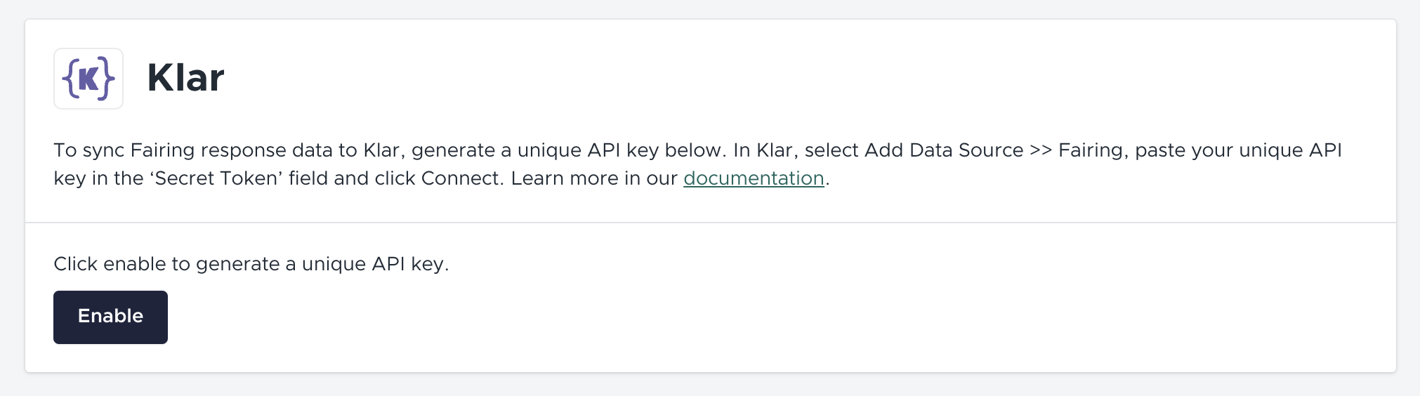 On the following page, paste your Fairing API key from Step 1. After you've pasted the key, select "Connect Fairing Data Source". Once saved, your data will begin syncing to Klar!