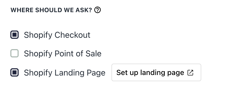 - To display a question on your Landing Page, you must target it to ‘Shopify Landing Page.’ In Fairing, navigate to Questions >> More actions >> Edit. Then scroll to ‘Where should we ask?’ and select ‘Shopify Landing Page.’