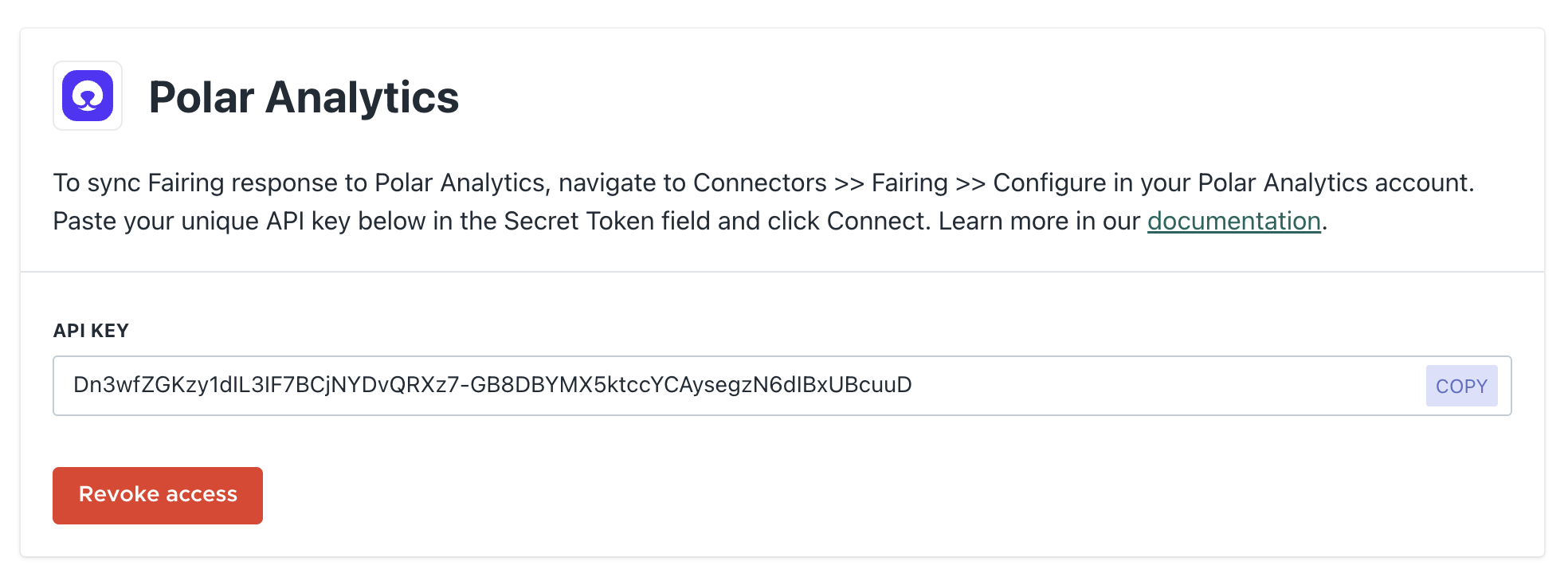 - In Fairing, navigate to Integrations >> Polar Analytics >> Connect. Generate a unique API key and click Copy.