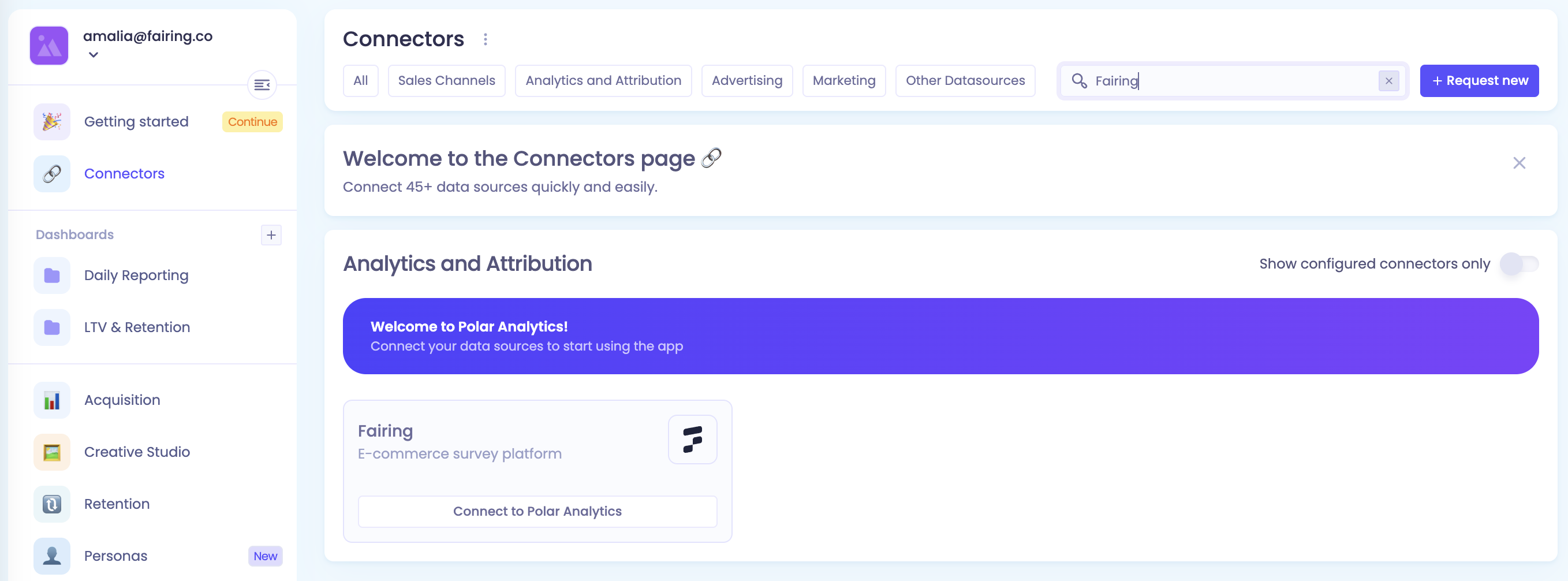 - In Polar Analytics, navigate to Connectors >> search for Fairing >> Connect to Polar Analytics