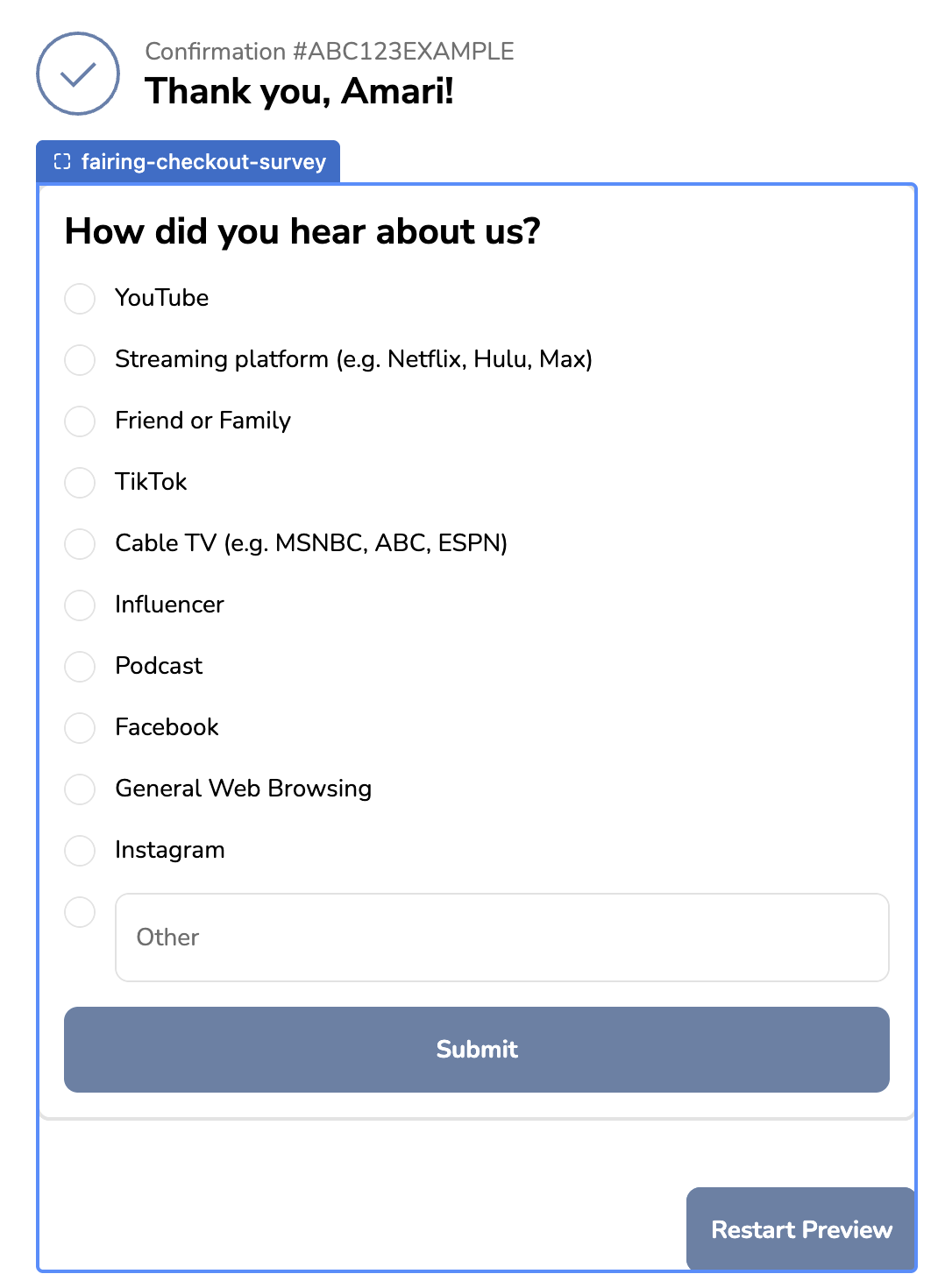 Utilize our preview functionality to see how your Question Stream will appear on your order confirmation page.