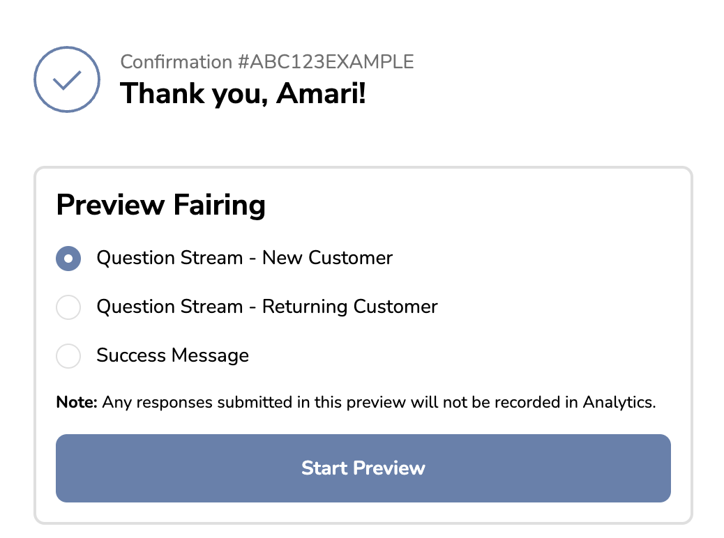 In the Fairing app block displayed on your checkout page, you can preview your Question Stream as a new or returning customer or go straight to your success message.