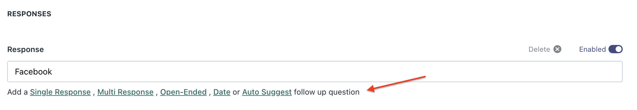 Our Response Clarification (two-step questions) feature allows you to ask a follow up question based on the first question response. This feature is only available on Single Response and NPS question types.