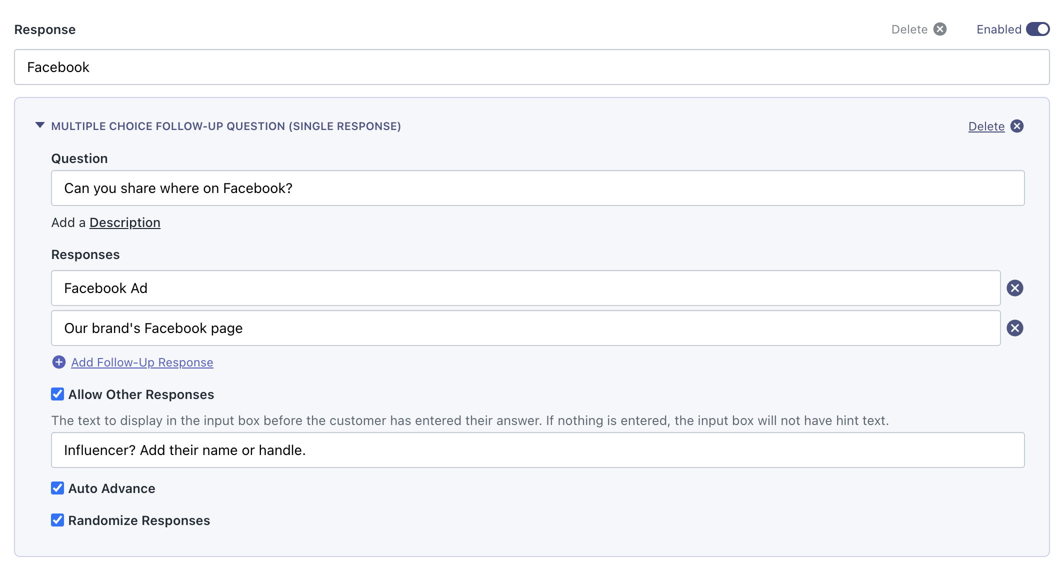 For example, after 'How did you hear about us?' if a customer selects 'Podcast', you could ask 'Which Podcast?'