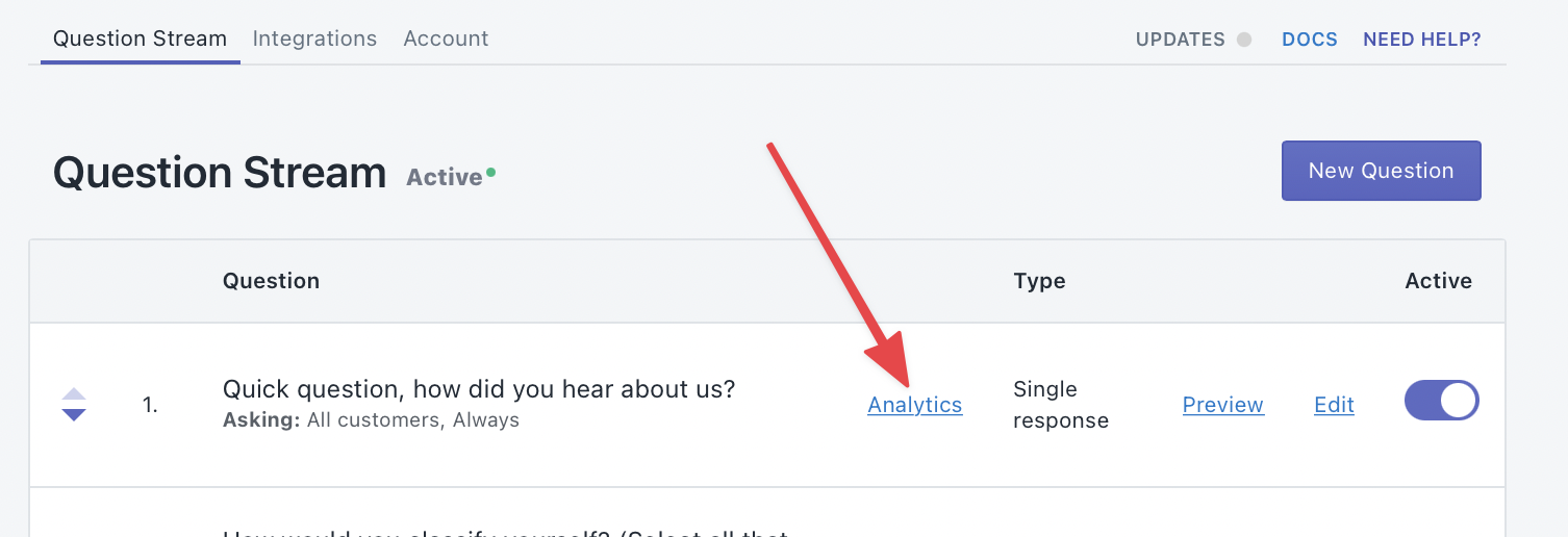 To view the question analytics for your clarification questions, click Analytics on the Question Stream page located next to the question title. You'll be taken to your dashboard, where you can view the metrics of your initial question. In this example we will use the question How did you hear about us?